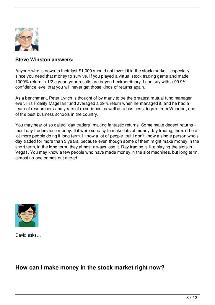 To Test Your Money marts$ Answers www.investoreducation.org back, but you might make money in two ways. First, the price of the stock can rise if the If you buy the stock of a new company, B. you can lose all of the money you ... Retrieve Content