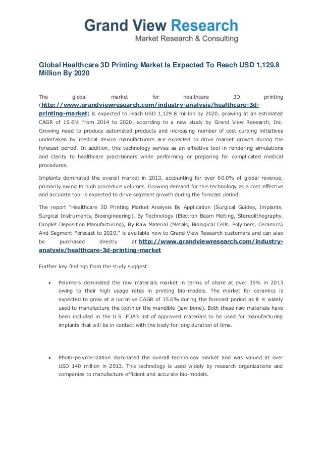 The healthcare market is expected to show significant growth as 3D printing is becoming widely used in medical applications. 3D printing in healthcare are summarized (figure 1). To better understand the potential and limitations of ... Access Document