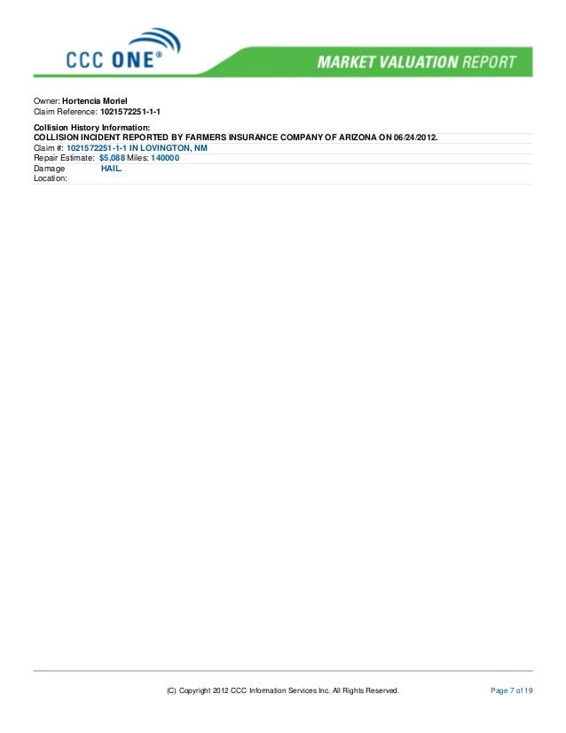 REPORT SUMMARY The CCC ONE@ Market Valuation Report reflects CCC Information Services Inc.'s opinion as to the value of the loss vehicle, based on information provided to CCC by DIRECT AUTO INSURANCE. Loss vehicle has 63% greater than ... View This Document